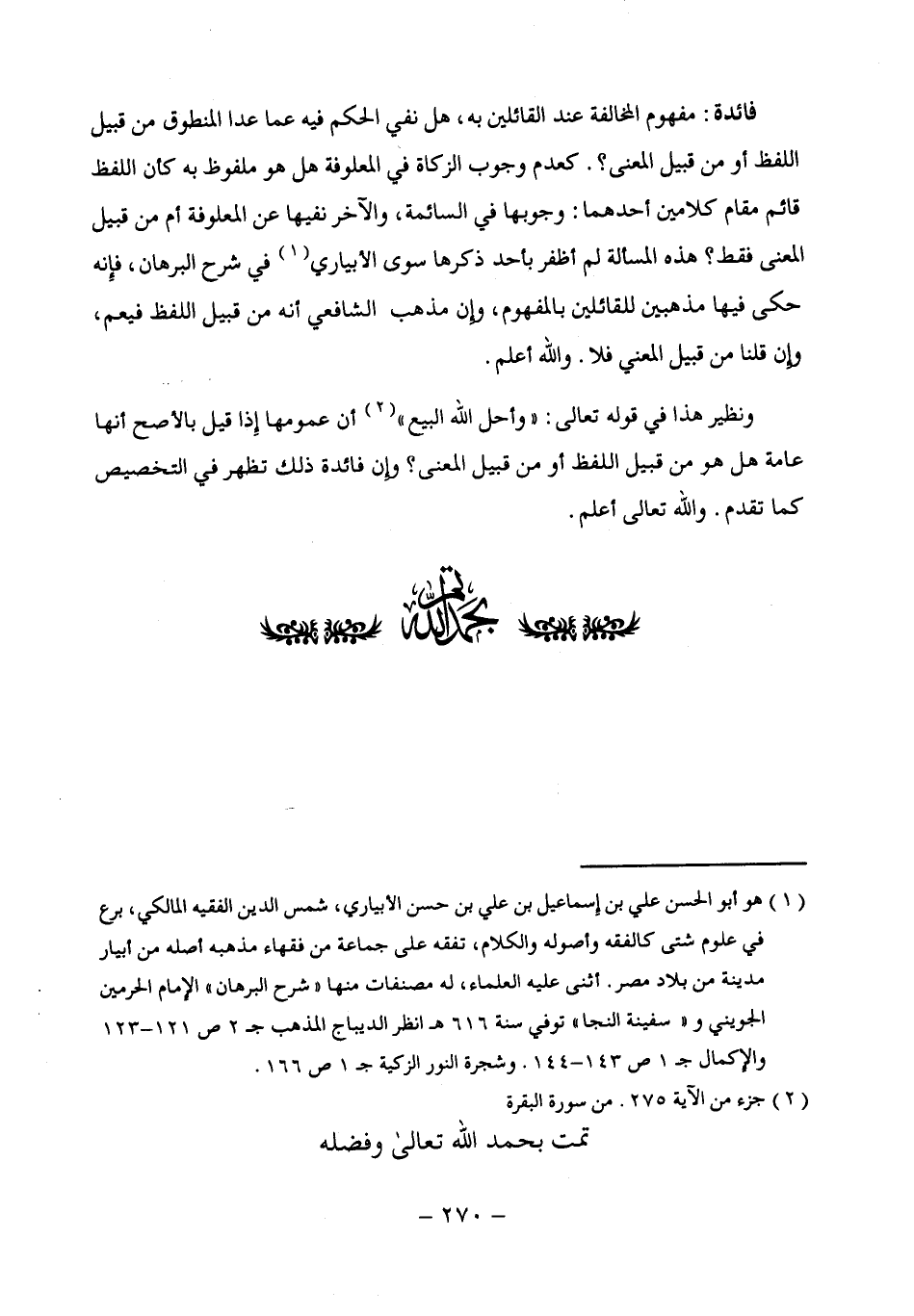 (¬1) هو أبو الحسن علي بن إِسماعيل بن علي بن حسن الأبيارى، شمس الدين الفقيه المالكي، برع في علوم شتى كالفقه وأصوله والكلام، تفقه على جماعة من فقهاء مذهبه أصله من أبيار مدينة من بلاد مصر. أثنى عليه العلماء؛ له مصنفات منها "شرح البرهان" الإمام الحرمين الجويني و "سفينة النجا" توفي سنة 616 هـ انظر الديباج المذهب جـ 2 ص 121 - 123 والإكمال جـ 1 ص 143 - 144. وشجرة النور الزكية جـ 1 ص 166.