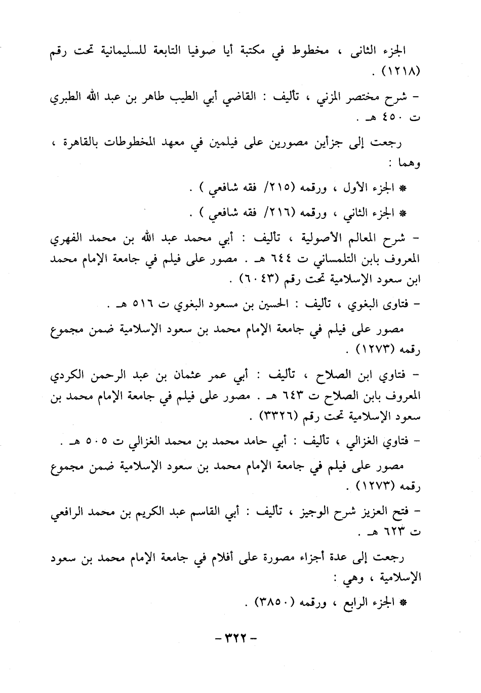 - فتاوي ابن الصلاح، تأليف: أبي عمر عثمان بن عبد الرحمن الكردي المعروف بابن الصلاح ت 643 هـ. مصور على فيلم في جامعة الإمام محمد بن سعود الإسلامية تحت رقم (3326).