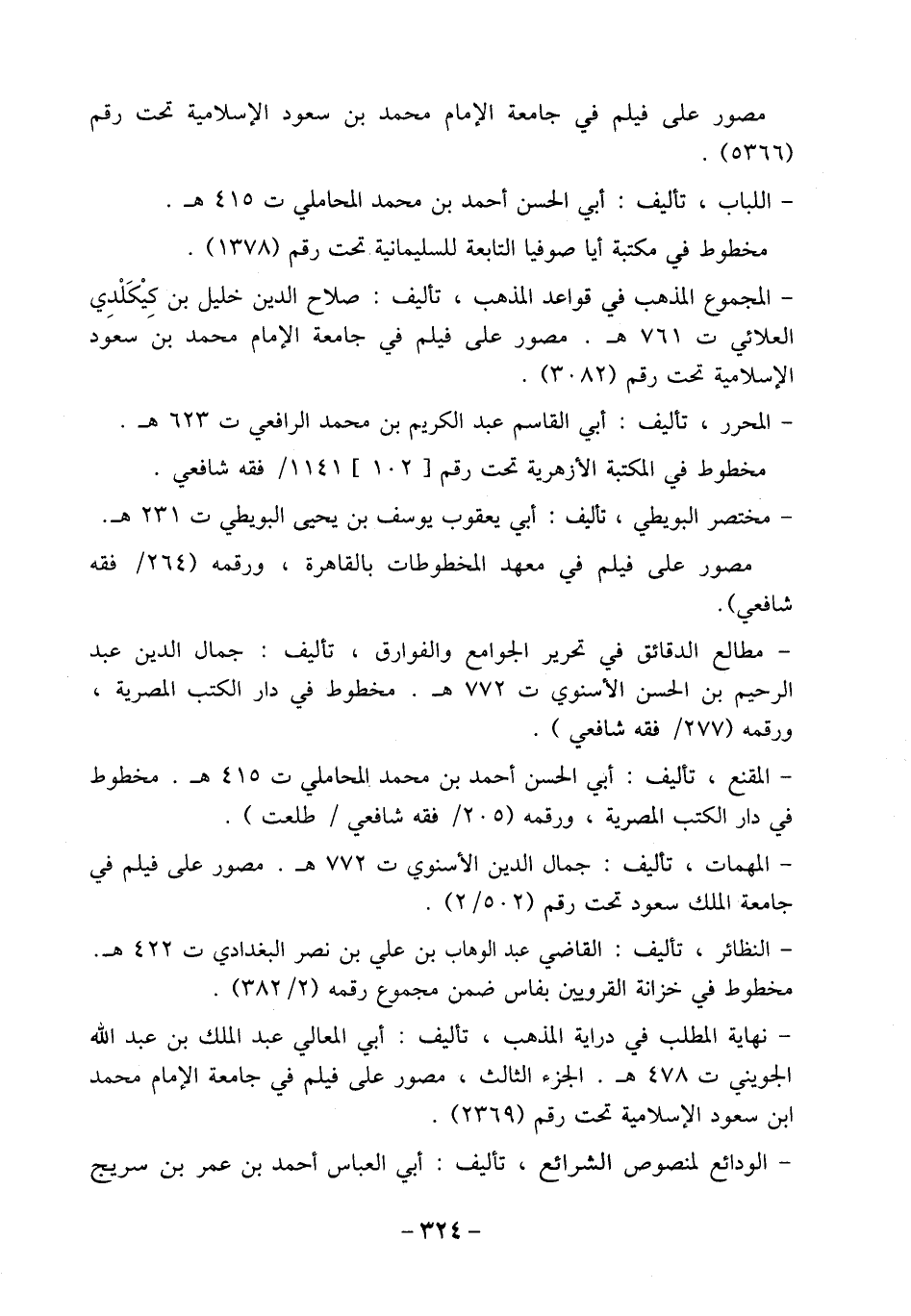 - المهمات، تأليف: جمال الدين الأسنوي ت 772 هـ. مصور على فيلم في جامعة الملك سعود تحت رقم (502/ 2).
