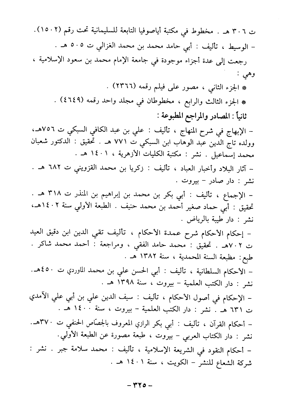 - الإبهاج في شرح المنهاج، تأليف: علي بن عبد الكافي السبكي ت 756 هـ، وولده تاج الدين عبد الوهاب ابن السبكي ت 771 هـ. تحقيق: الدكتور شعبان محمد إسماعيل. نشر: مكتبة الكليات الأزهرية، 1401 هـ.