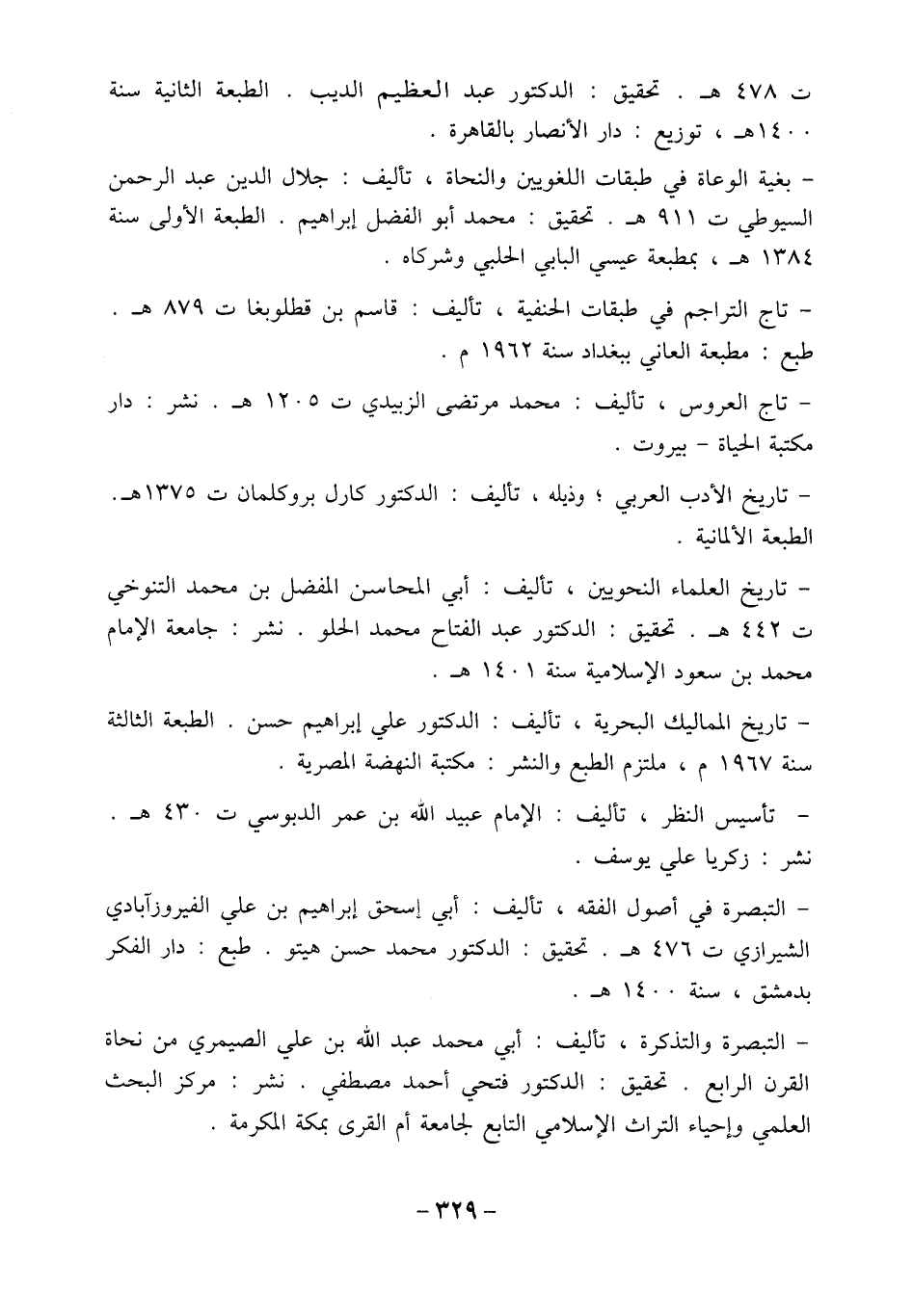 - التبصرة والتذكرة، تأليف: أبي محمد عبد الله بن علي الصيمري من نحاة القرن الرابع. تحقيق: الدكتور فتحي أحمد مصطفي. نشر: مركز البحث العلمي وإحياء التراث الإسلامي التابع لجامعة أم القرى بمكة المكرمة.