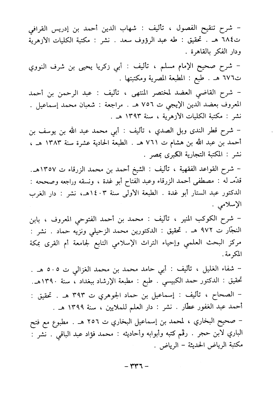 - شرح تنقيح الفصول، تأليف: شهاب الدين أحمد بن إدريس القرافي ت 684 هـ. تحقيق: طه عبد الرؤوف سعد. نشر: مكتبة الكليات الأزهرية ودار الفكر بالقاهرة.