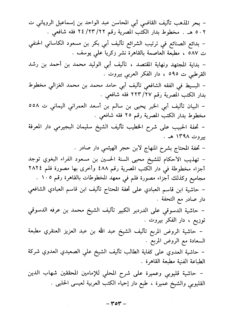 - بحر المذهب تأليف القاضي أبي المحاسن عبد الواحد بن إسماعيل الروياني ت 502 هـ. مخطوط بدار الكتب المصرية رقم 22/ 23/ 24 فقه شافعي.