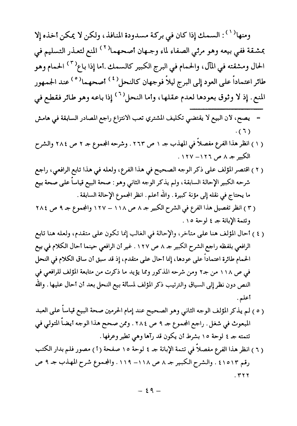 (¬4) أحال المؤلف هنا على متأخر، والإحالة في الغالب إِنما تكون على متقدم، ولعله هنا تابع الرافعي بلفظه راجع الشرح الكبير جـ 8 ص 127. غير أن الرافعي حينما أحال الكلام في بيع الحمام طائرة اعتمادًا على عودها، إِنما أحال على متقدم، إذ قد سبق أن ساق الكلام في النحل في ص 118 من جـ 2 ومن شرحه المذكور ومما يؤيد ما ذكرت من متابعة المؤلف للرافعي في النص دون نظر إلى السياق والترتيب ذكر المؤلف لمسألة بيع النحل بعد أن أحال عليها. والله أعلم.