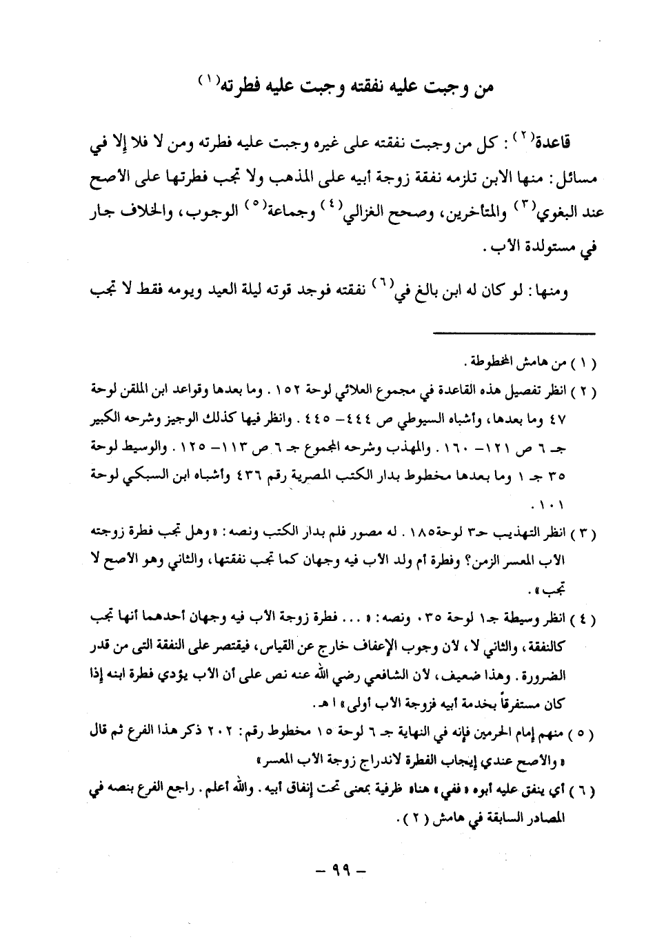 (¬4) انظر وسيطة جـ 1 لوحة 35. ونصه: " ... فطرة زوجة الأب فيه وجهان أحدهما أنها تجب كالنفقة، والثاني لا؛ لأن وجوب الإِعفاف خارج عن القياس، فيقتصر علي النفقة التي من قدر الضرورة. وهذا ضعيف؛ لأن الشافعي رضي الله عنه نص علي أن الأب يؤدي فطرة ابنه إِذا كان مستفرقًا بخدمة أبيه فزوجة الأب أولي" اهـ.