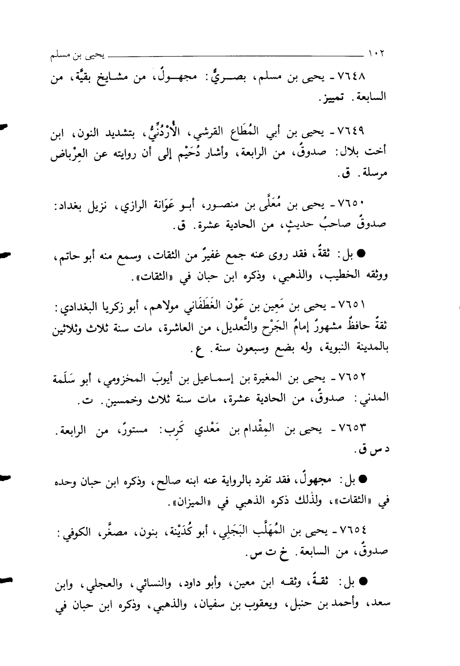 7651 - يحيى بن مَعِين بن عَوْن الغَطَفَاني مولاهم، أبو زكريا البغدادي: ثقةٌ حافظٌ مشهورٌ إمامُ الجَرْح والتَّعديل، من العاشرة، مات سنة ثلاث وثلاثين بالمدينة النبوية، وله بضع وسبعون سنة. ع.
