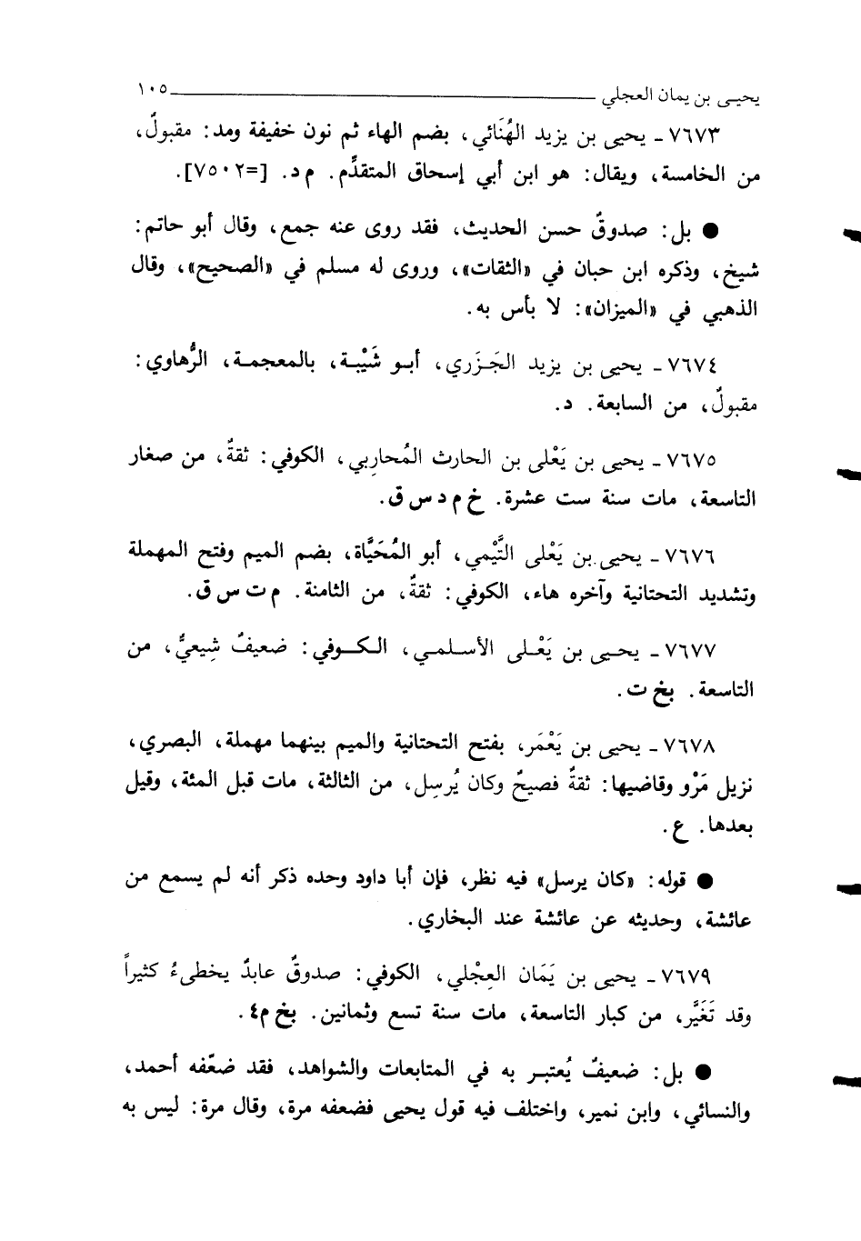 7679 - يحيى بن يَمَان العِجْلي، الكوفي: صدوقٌ عابدٌ يخطئُ كثيرًا وقد تَغَيَّر، من كبار التاسعة، مات سنة تسع وثمانين. بخ م 4.