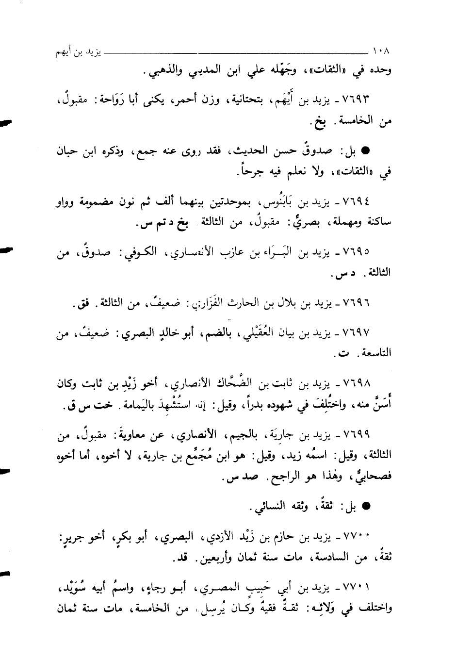 7694 - يزيد بن بَابَنُوس، بموحدتين بينهما ألف ثم نون مضمومة وواو ساكنة ومهملة، بصري: مقبولٌ، من الثالثة. بخ د تم س.