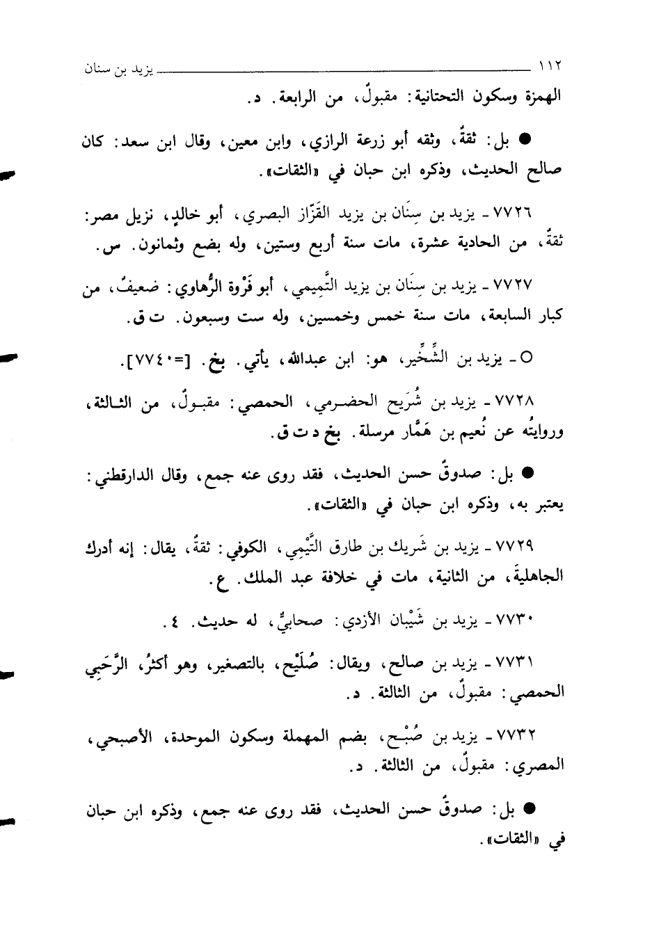 7731 - يزيد بن صالح، ويقال: صُلَيْح، بالتصغير، وهو أكثرُ، الرَّحَبي الحمصي: مقبولٌ، من الثالثة. د.