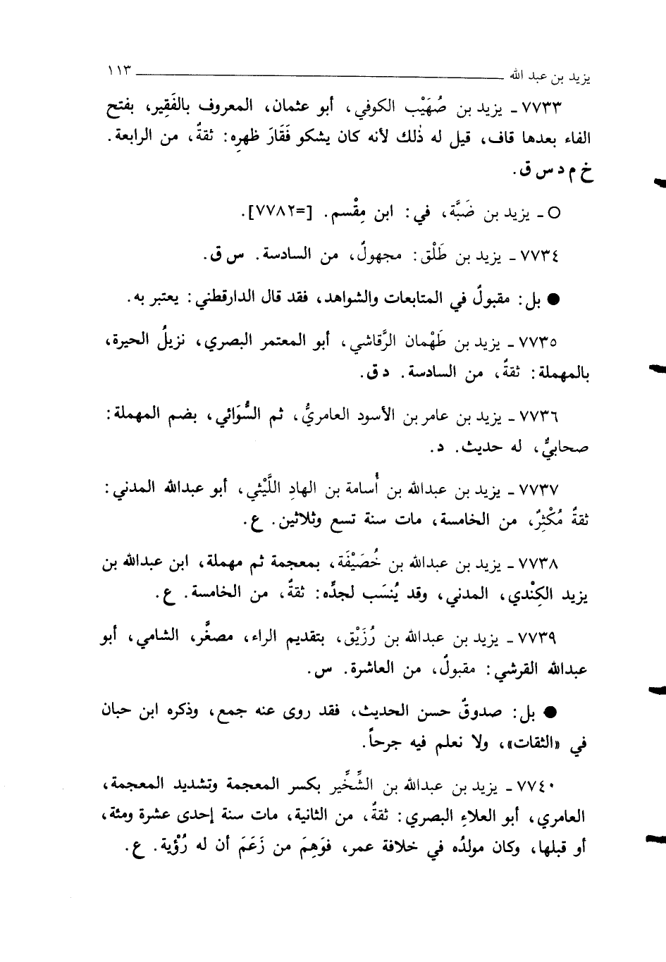 7740 - يزيد بن عبد الله بن الشِّخِّير بكسر المعجمة وتشديد المعجمة، العامري، أبو العلاءِ البصري: ثقةٌ، من الثانية، مات سنة إحدى عشرة ومئة، أو قبلها، وكان مولدُه في خلافة عمر، فوَهِمَ من زَعَمَ أن له رُؤْية. ع.