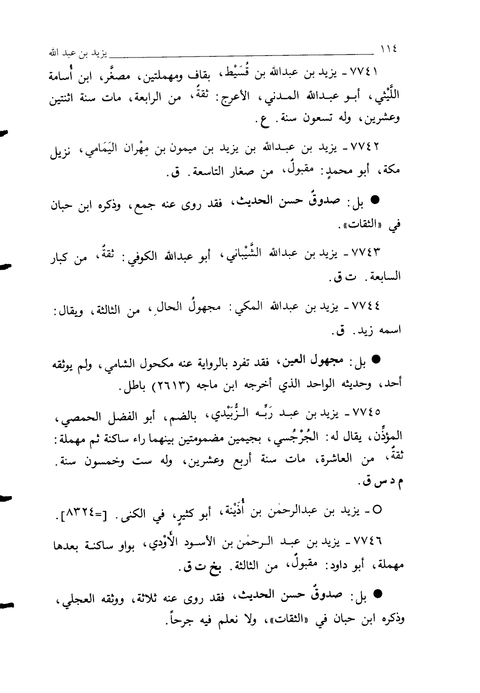7744 - يزيد بن عبد الله المكي: مجهولٌ الحالِ، من الثالثة, ويقال: اسمه زيد. ق.