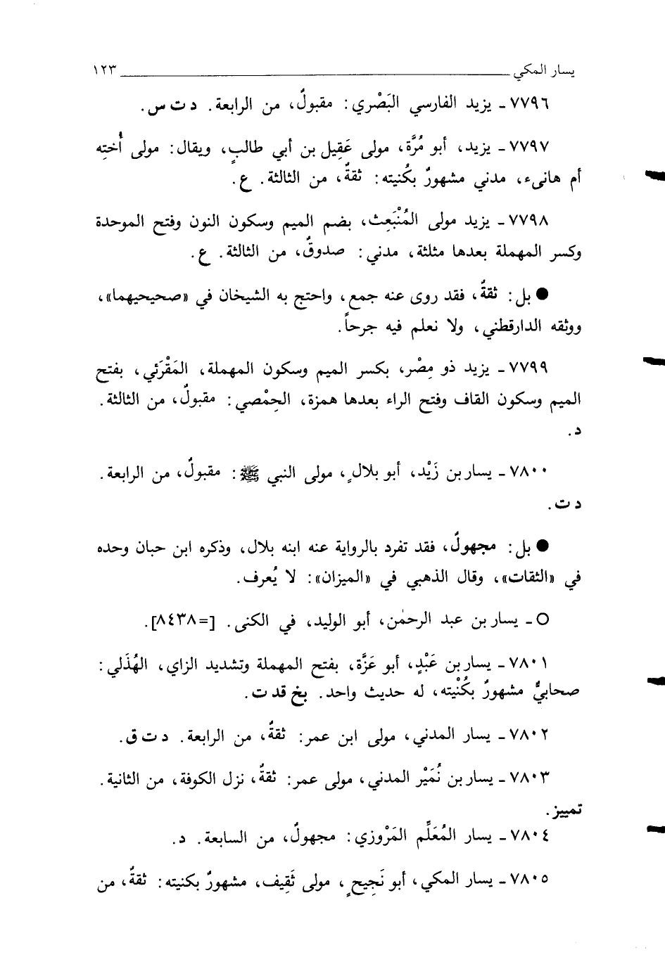 7803 - يسار بن نُمَيْر المدني، مولى عمر: ثقةٌ، نزل الكوفة، من الثانية. تمييز.