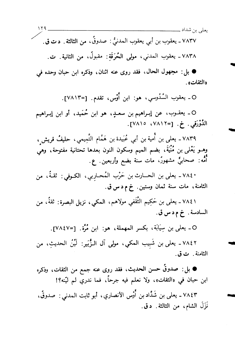7843 - يعلى بن شَدَّاد بن أوْس الأنصاري، أبو ثابت المدني: صدوقٌ، نَزَلَ الشام، من الثالثة. د ق.