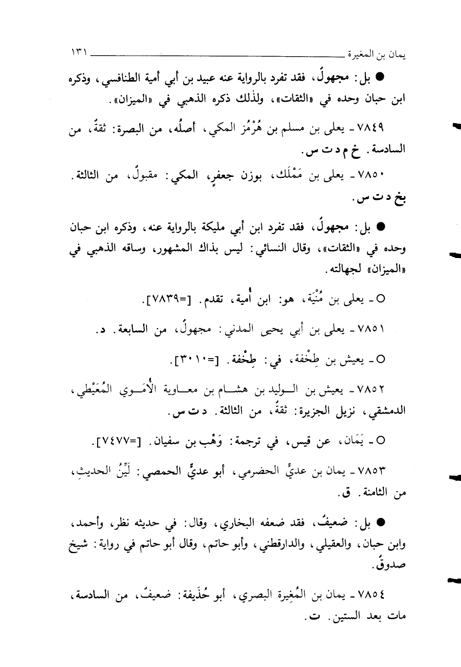 7854 - يمان بن المُغِيرة البصري، أبو حُذَيفة: ضعيفٌ، من السادسة، مات بعد الستين. ت.