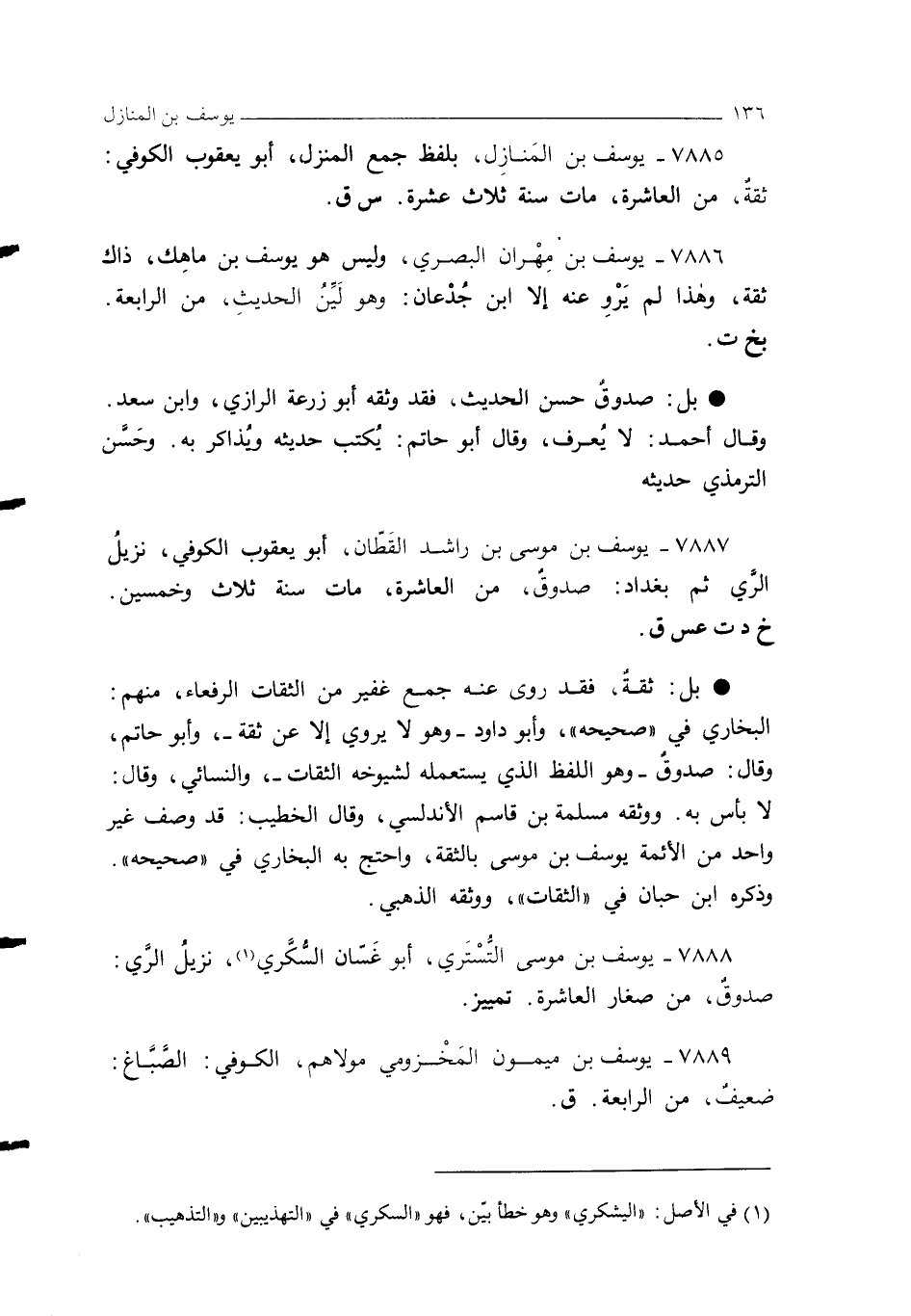 7885 - يوسف بن المَنازِل، بلفظ جمع المنزل، أبو يعقوب الكوفي: ثقةٌ، من العاشرة، مات سنة ثلاث عشرة. س ق.