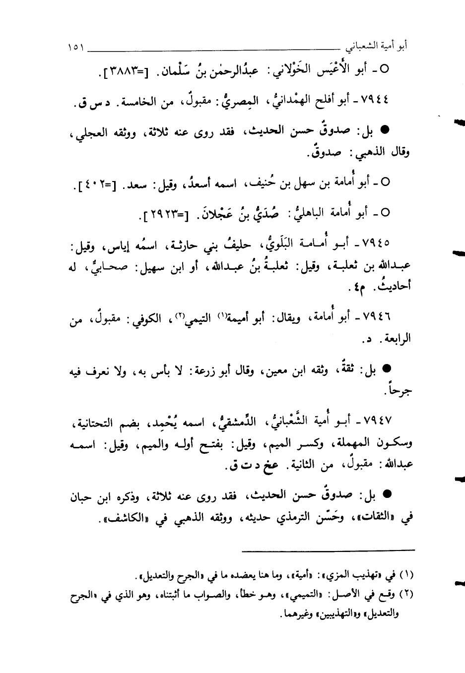 7947 - أبو أُمية الشَّعْباني، الدِّمشقي، اسمه يُحْمِد، بضم التحتانية، وسكون المهملة، وكسر الميم، وقيل: بفتح أوله والميم، وقيل: اسمه عبد الله: مقبولٌ، من الثانية. عخ د ت ق.