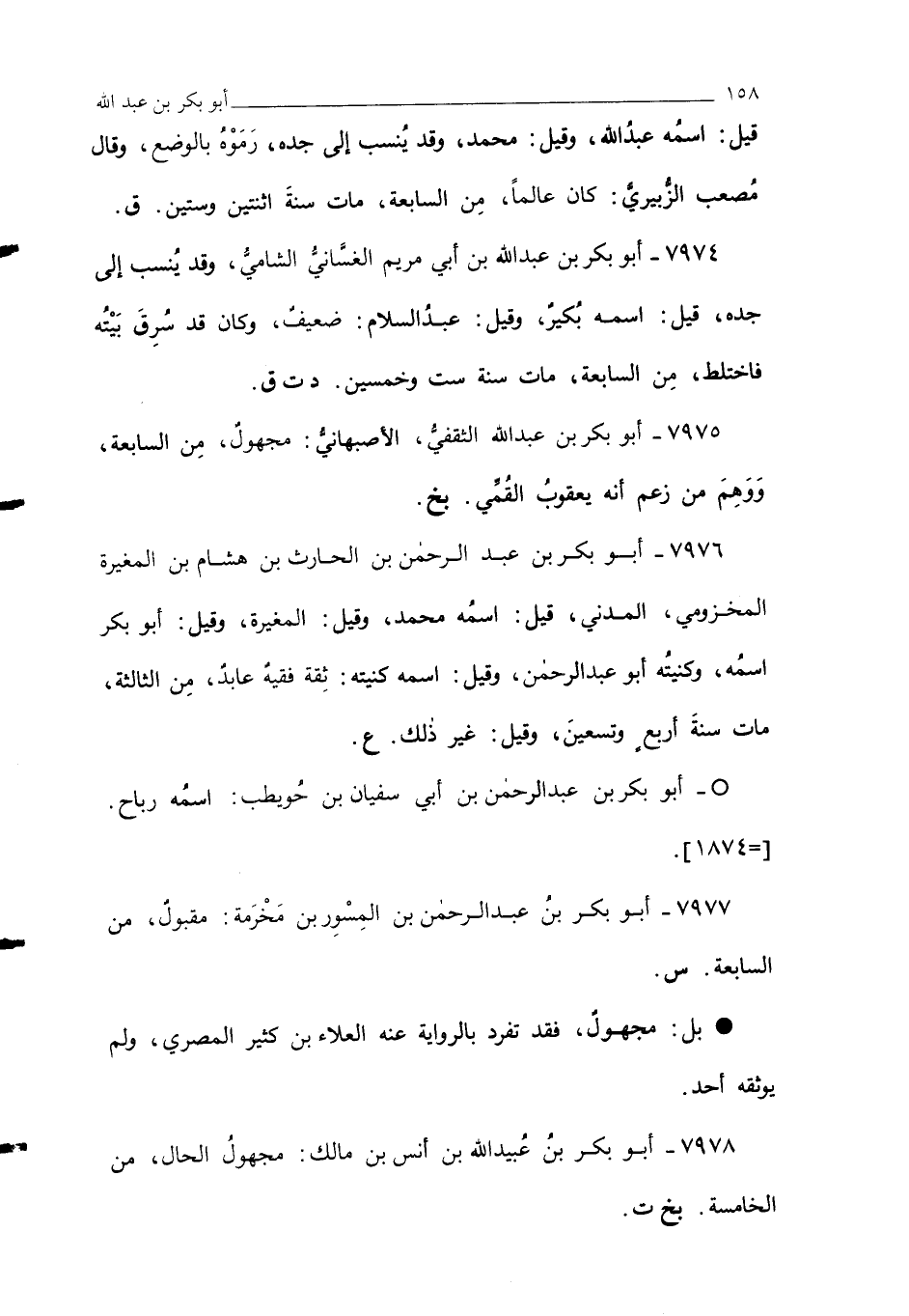 7975 - أبو بكر بن عبد الله الثقفي، الأصبهاني: مجهولٌ، مِن السابعة، وَوَهِمَ من زعم أنه يعقوبُ القُمِّي. بخ.