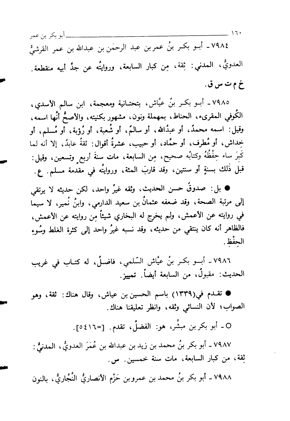 7986 - أبو بكر بن عيَّاش السّلمي، فاضل، له كتاب في غريب الحديث: مقبولٌ، من السابعة أيضًا. تمييز.