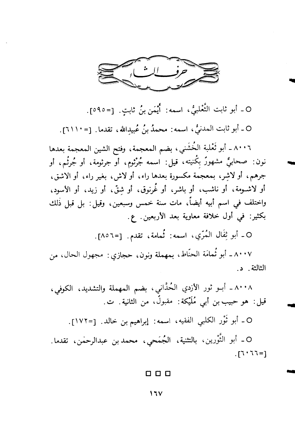 8006 - أبو ثَعْلبة الخُشَني، بضم المعجمة، وفتح الشين المعجمة بعدها نون: صحابيٌّ مشهورٌ بِكُنيته، قيل: اسمه جُرْثوم، أو جرثومة، أو جُرثُم، أو جرهم، أو لاشِر، بمعجمة مكسورة بعدها راء، أو لاش، بغير راء، أو الاشق، أو لاشومة، أو ناشب، أو باشر، أو غُرنوق، أو شِقّ، أو زيد، أو الأسود، واختلف في اسم أبيه أيضًا، مات سنة خمس وسبعين، وقيل: بل قبل ذلك بكثير: في أول خلافة معاوية بعد الأربعين. ع.