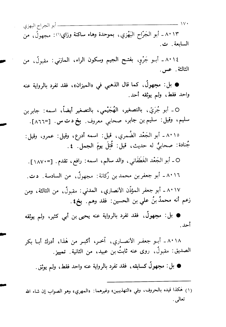 8013 - أبو الجَرّاح البَهْزي، بموحدة وهاء ساكنة وزاي (¬1): مجهولٌ، من السابعة. ت.