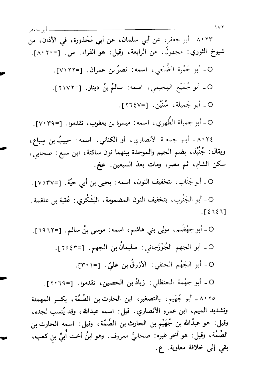 8023 - أبو جعفر، عن أبي سلمان، عن أبي مَحْذورة، في الأذان، من شيوخ الثوري: مجهولٌ، من الرابعة، وقيل: هو الفراء. س. [= 8020].