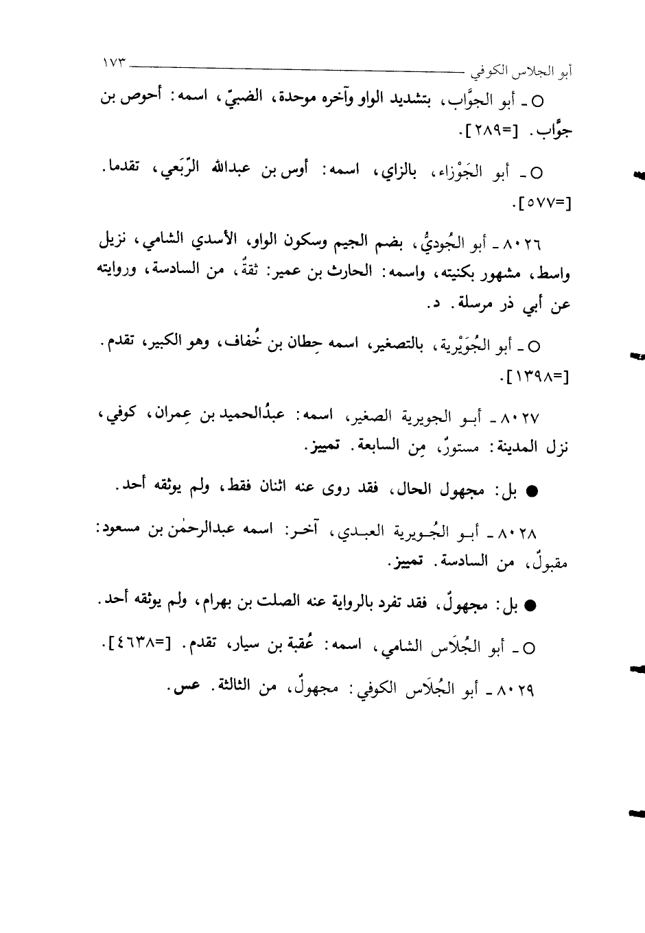 ° - أبو الجوَّاب، بتشديد الواو وآخره موحدة، الضبيّ، اسمه: أحوص بن جوَّاب. [=289].