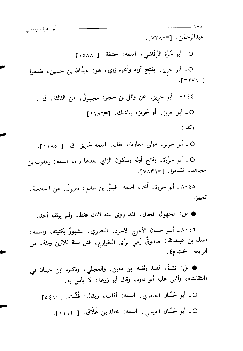 8046 - أبو حسان الأعرج الأحرد، البصري، مشهورٌ بكنيته، واسمه: مسلم بن عبد الله: صدوقٌ رُمِيَ برأي الخوارج، قتل سنة ثلاثين ومئة، من الرابعة. خت م 4.