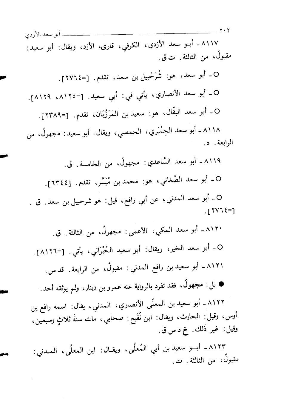 8117 - أبو سعد الأزدي، الكوفي، قارئ الأزد، ويقال: أبو سعيد: مقبولٌ، من الثالثة. ت ق.