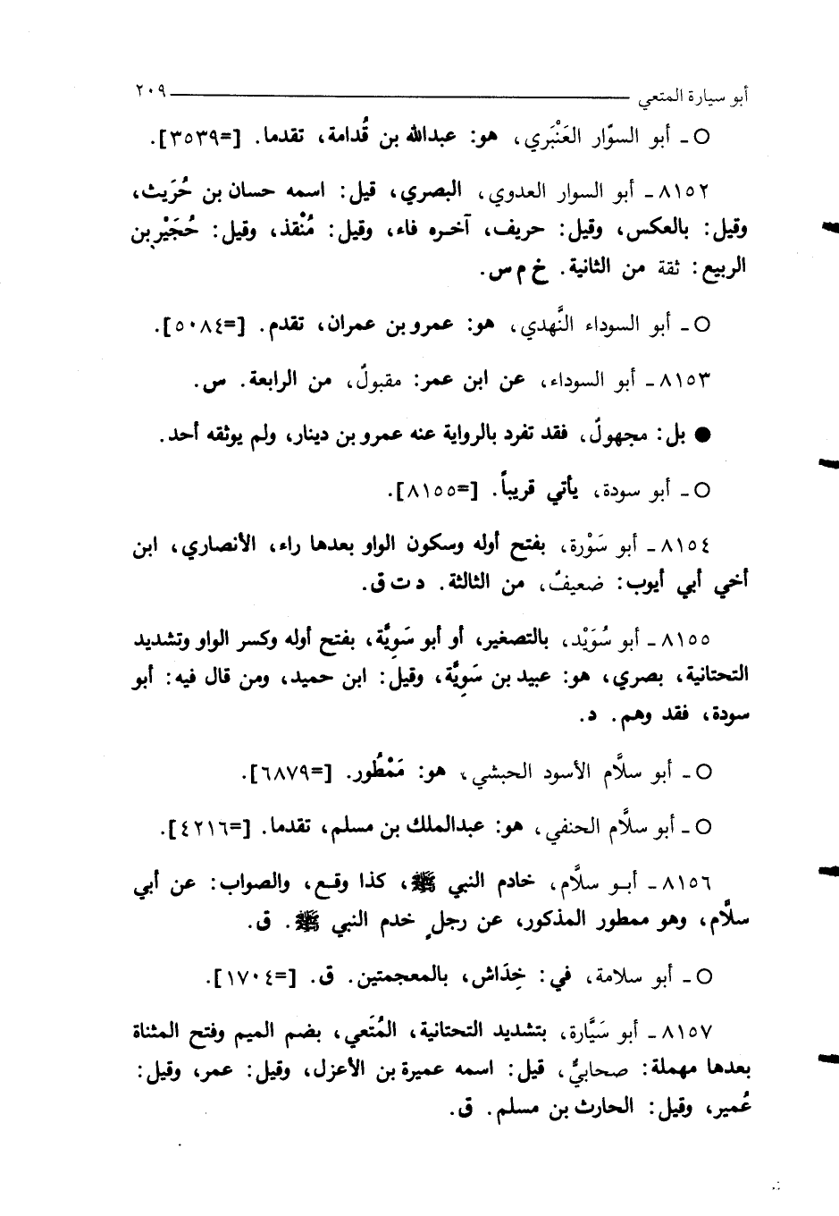 8155 - أبو سُوَيد، بالتصغير، أو أبو سَوِيَّة، بفتح أوله وكسر الواو وتشديد التحتانية، بصري، هو: عبيد بن سَوِيَّة، وقيل: ابن حميد، ومن قال فيه: أبو سودة، فقد وهم. د.