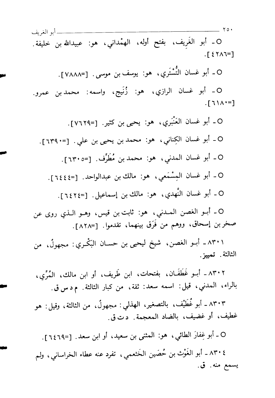 8303 - أبو غُطَيف، بالتصغير، الهذلي: مجهول، من الثالثة، وقيل: هو غطيف، أو غضيف، بالضاد المعجمة. د ت ق.