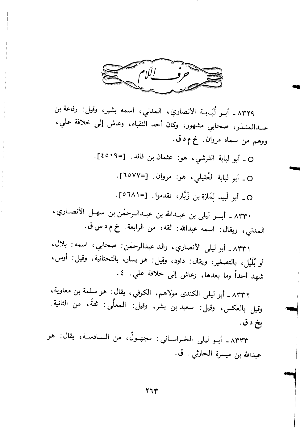 8331 - أبو ليلى الأنصاري، والد عبد الرحمن: صحابي، اسمه: بلال، أو بُلَيْل، بالتصغير، ويقال: داود، وقيل: هو يسار، بالتحتانية، وقيل: أوس، شهد أحدًا وما بعدها، وعاش إلى خلافة علي. 4.