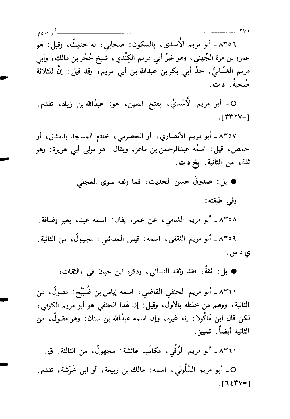8360 - أبو مريم الحنفي القاضي، اسمه إياس بن ضُبَيْح: مقبولٌ، من الثانية، ووهم من خلطه بالأول، وقيل: إن هذا الحنفي هو أبو مريم الكوفي، لكن قال ابن مَاكُولا: إنه غيره، وإن اسمه عبدُ الله بن سنان: وهو مقبولٌ، من الثانية أيضًا. تمييز.
