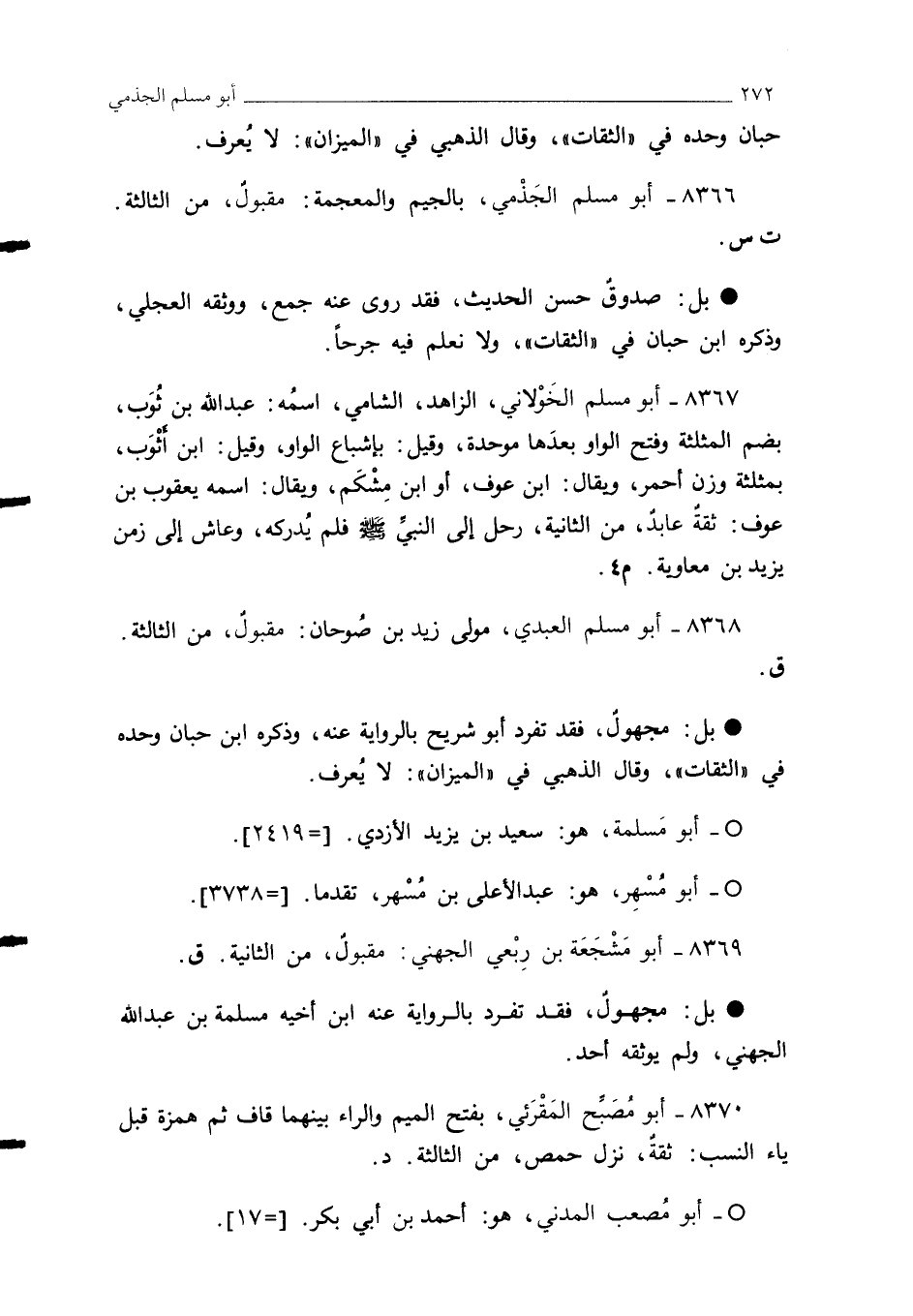 8366 - أبو مسلم الجَذْمي، بالجيم والمعجمة: مقبولٌ، من الثالثة. ت س.