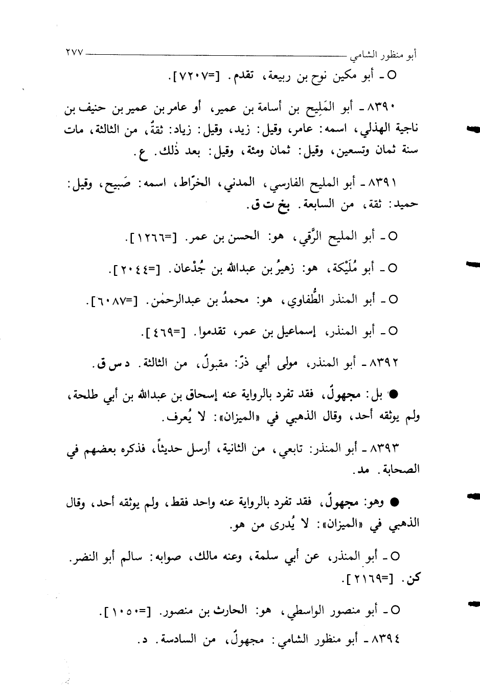 8390 - أبو المَلِيح بن أسامة بن عمير، أو عامر بن عمير بن حنيف بن ناجية الهذلي، اسمه: عامر، وقيل: زيد، وقيل: زياد: ثقةٌ، من الثالثة، مات سنة ثمان وتسعين، وقيل: ثمان ومئة، وقيل: بعد ذلك. ع.