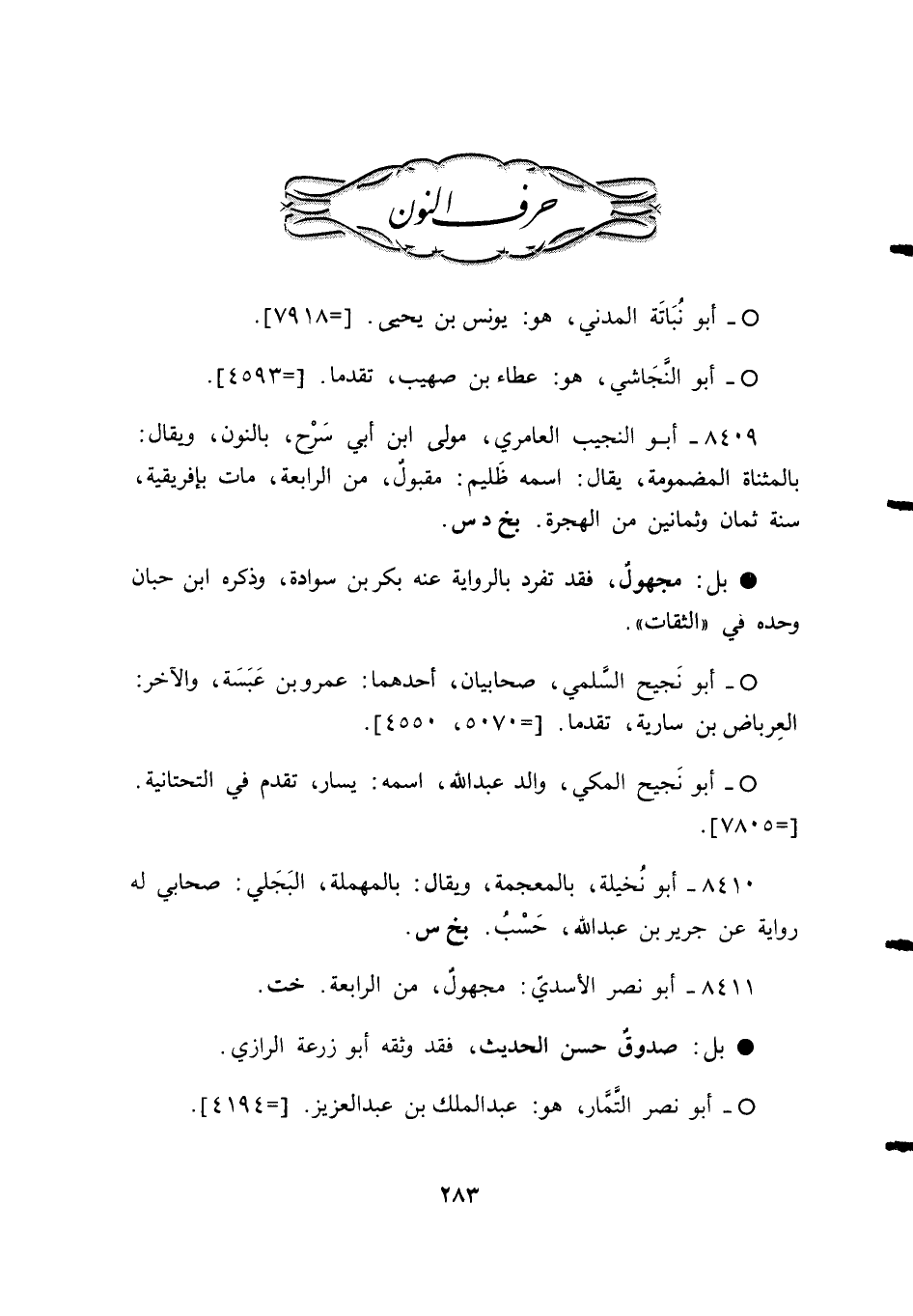 8409 - أبو النجيب العامري، مولى ابن أبي سَرْح، بالنون، ويقال: بالمثناة المضمومة، يقال: اسمه ظَليم: مقبولٌ، من الرابعة، مات بإفريقية، سنة ثمان وثمانين من الهجرة. بخ د س.