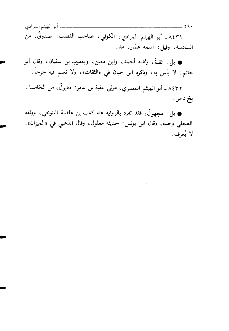 8431 - أبو الهيثم المرادي، الكوفي، صاحب القصب: صدوقٌ، من السادسة، وقيل: اسمه عمّار. مد.