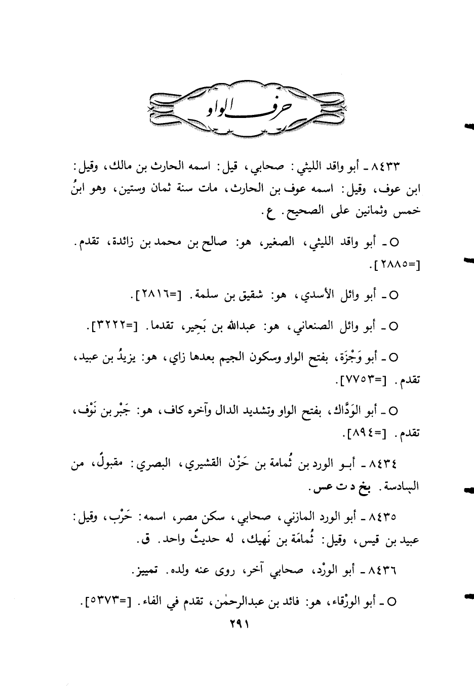8433 - أبو واقد الليثي: صحابي، قيل: اسمه الحارث بن مالك، وقيل: ابن عوف، وقيل: اسمه عوف بن الحارث، مات سنة ثمان وستين، وهو ابنُ خمس وثمانين على الصحيح. ع.
