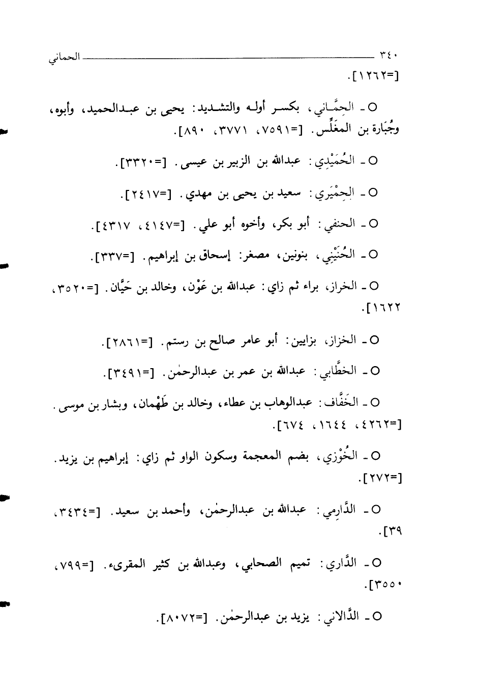 ° - الحِمَّاني، بكسر أوله والتشديد: يحيى بن عبد الحميد، وأبوه، وجُبَارة بن المغَلِّس. [= 7591، 3771، 890].