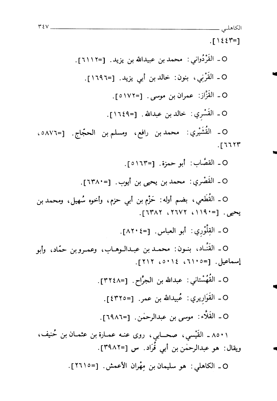 ° - القَنَّاد، بنون: محمد بن عبد الوهاب، وعمرو بن حمّاد، وأبو إسماعيل. [= 6105، 5014، 212].
