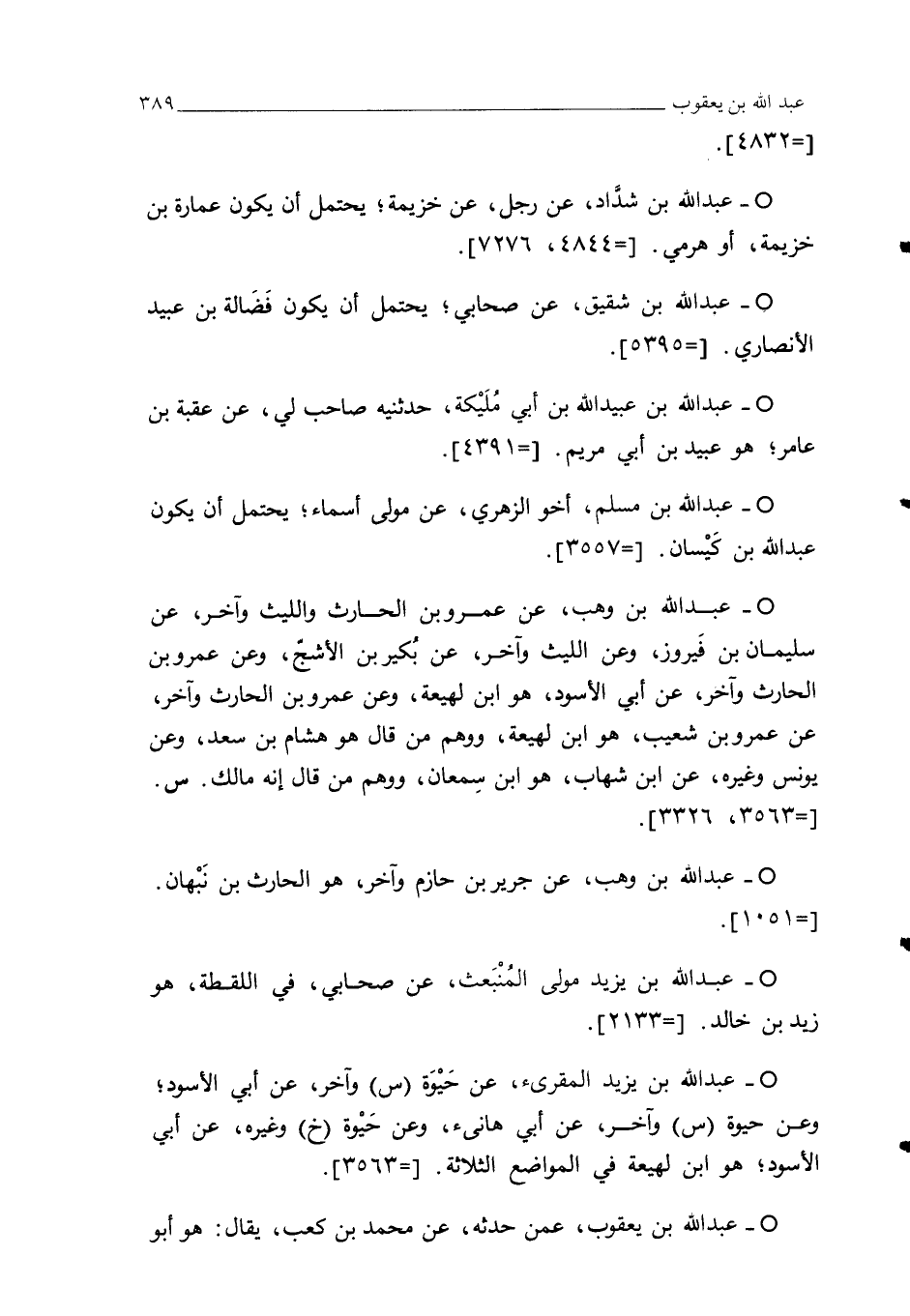 ° - عبد الله بن وهب، عن عمرو بن الحارث والليث وآخر، عن سليمان بن فَيروز، وعن الليث وآخر، عن بُكير بن الأشجّ، وعن عمرو بن الحارث وآخر، عن أبي الأسود، هو ابن لهيعة، وعن عمرو بن الحارث وآخر، عن عمرو بن شعيب، هو ابن لهيعة، ووهم من قال هو هشام بن سعد، وعن يونس وغيره، عن ابن شهاب، هو ابن سِمعان، ووهم من قال إنه مالك. س. [= 3563، 3326].