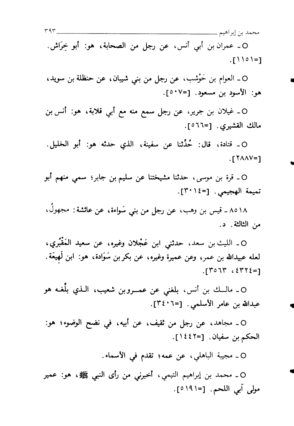 ° - محمَّد بن إبراهيم التيمي، أخبرني من رأى النبي - صلى الله عليه وسلم -، هو: عمير مولى آبي اللحم. [= 5191].