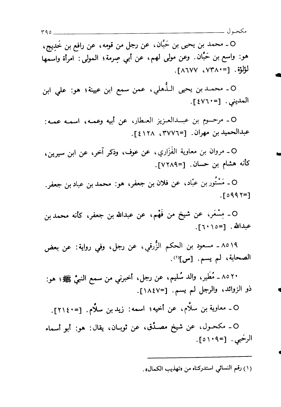 ° - محمَّد بن يحيى بن حَبَّان، عن رجل من قومه، عن رافع بن خَدِيج، هو: واسع بن حَبَّان. وعن مولى لهم، عن أبي صِرمة؛ المولى: امرأة واسمها لؤلؤة. [= 7380، 8677].