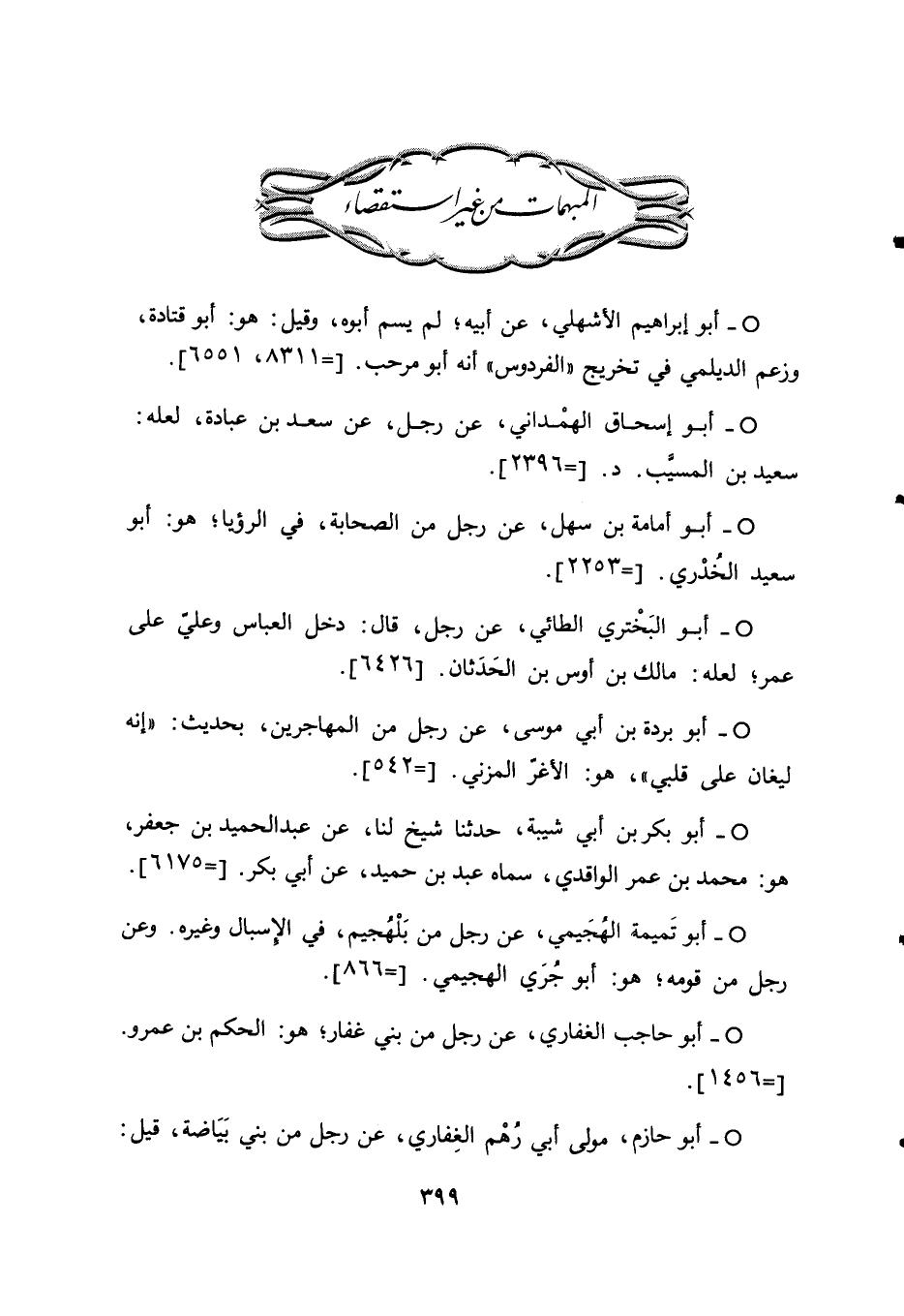 ° - أبو بردة بن أبي موسى، عن رجل من المهاجرين، بحديث: "إنه ليغان على قلبي"، هو: الأغرّ المزني. [= 542].