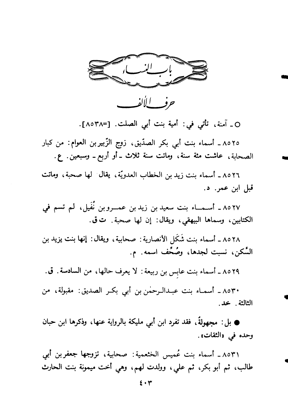 8531 - أسماء بنت عُميس الخثعمية: صحابية، تزوجها جعفر بن أبي طالب، ثمَّ أبو بكر، ثمَّ علي، وولدت لهم، وهي أخت ميمونة بنت الحارث