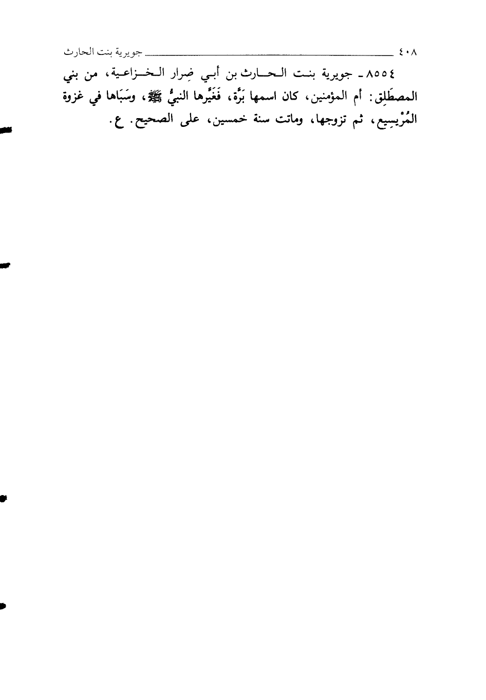 8554 - جويرية بنت الحارث بن أبي ضِرار الخزاعية، من بني المصطَلِق: أم المؤمنين، كان اسمها بَرَّة، فَغَيَّرها النبيُّ - صلى الله عليه وسلم -، وسَبَاها في غزوة المُرْيسِيع، ثم تزوجها، وماتت سنة خمسين، على الصحيح. ع.