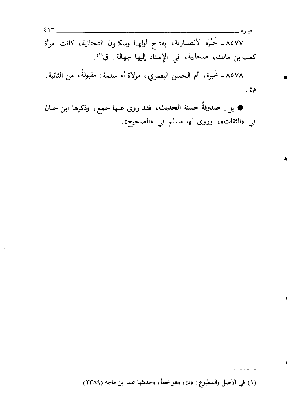 8577 - خَيْرَة الأنصارية، بفتح أولها وسكون التحتانية، كانت امرأة كعب بن مالك، صحابية، في الإسناد إليها جهالة. ق (¬1).