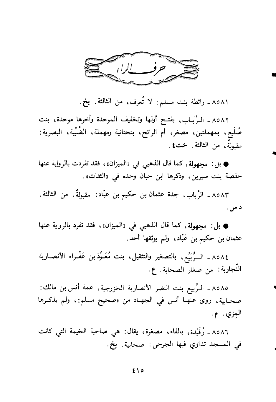8585 - الرُّبيع بنت النضر الأنصارية الخزرجية، عمة أنس بن مالك: صحابية، روى عنها أنس في الجهاد من "صحيح مسلم"، ولم يذكرها المِزي. م.