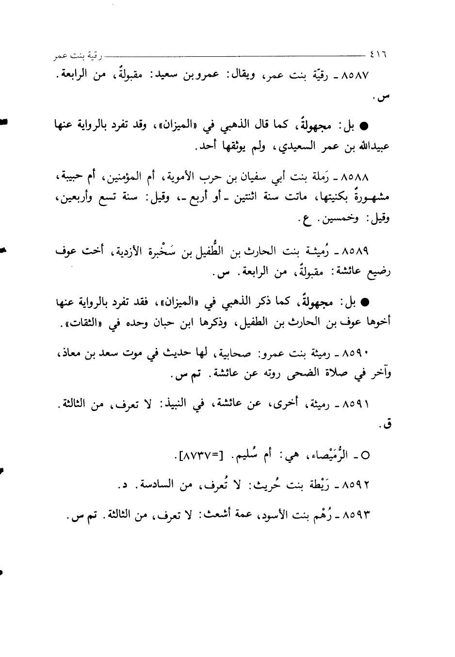 8590 - رميثة بنت عمرو: صحابية، لها حديث في موت سعد بن معاذ، وآخر في صلاة الضحى روته عن عائشة. تم س.