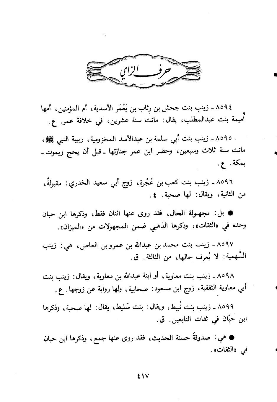 8596 - زينب بنت كعب بن عُجْرة، زوج أبي سعيد الخدري: مقبولةٌ، من الثانية، ويقال: لها صحبة. 4.