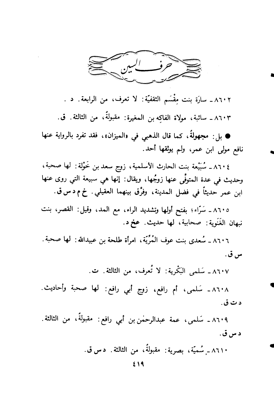 8602 - سارَة بنت مِقْسَم الثقفيّة: لا تعرف، من الرابعة. د.